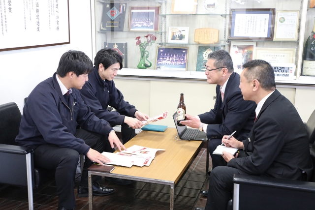 社員全員が正社員である当社は、社員の教育・育成にも力を入れています。営業社員を中心に日本酒や焼酎、ワインの蔵元研修や、「ソムリエ」「利酒師」「ウイスキー検定」など有資格者の育成に積極的に取り組んでいます。社員ひとりひとりのスキルアップと人間力の向上を図り、その力を集結し全社全力営業で「地域№1の種類流通業」を目指しています。